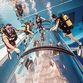 Pierwsze nurkowanie scuba diving (ze sprzętem) do 12m to najlepszy sposób na rozpoczęcie przygody w najgłębszym basenie do nurkowania w Europie – pierwszy oddech pod wodą, uczucie nieważkości to niezapomniane emocje! A to wszystko w komfortowych i przede wszystkim bezpiecznych warunkach!